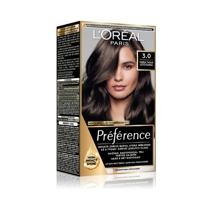 L'Oréal Paris Préférence farba na vlasy s intenzívnymi farebnými pigmentami dodáva vlasom trvalé zafarbenie s lesklým elixírom Shine Complex. Vlasy pôsobia ako čerstvo nafarbené až 8 týždňov! L'Oréal Paris Préférence spoľahlivo a 100 % prekrýva aj šedivé vlasy! Balzam po farbení obohatený o vitamín E poskytuje intenzívnu starostlivosť, jemný lesk a UV ochranu. Vlasy sú dokonale lesklé a hodvábne jemné. Farba na vlasy L'Oréal Paris Préférence teraz s novou príťažlivou vôňou.