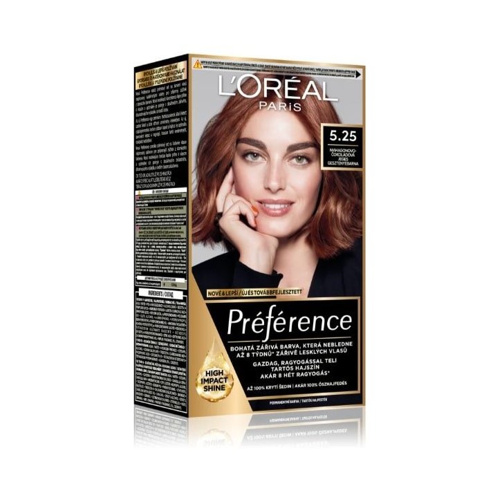 L'Oréal Paris Préférence farba na vlasy s intenzívnymi farebnými pigmentami dodáva vlasom trvalé zafarbenie s lesklým elixírom Shine Complex. Vlasy pôsobia ako čerstvo nafarbené až 8 týždňov! L'Oréal Paris Préférence spoľahlivo a 100 % prekrýva aj šedivé vlasy! Balzam po farbení obohatený o vitamín E poskytuje intenzívnu starostlivosť, jemný lesk a UV ochranu. Vlasy sú dokonale lesklé a hodvábne jemné. Farba na vlasy L'Oréal Paris Préférence teraz s novou príťažlivou vôňou.