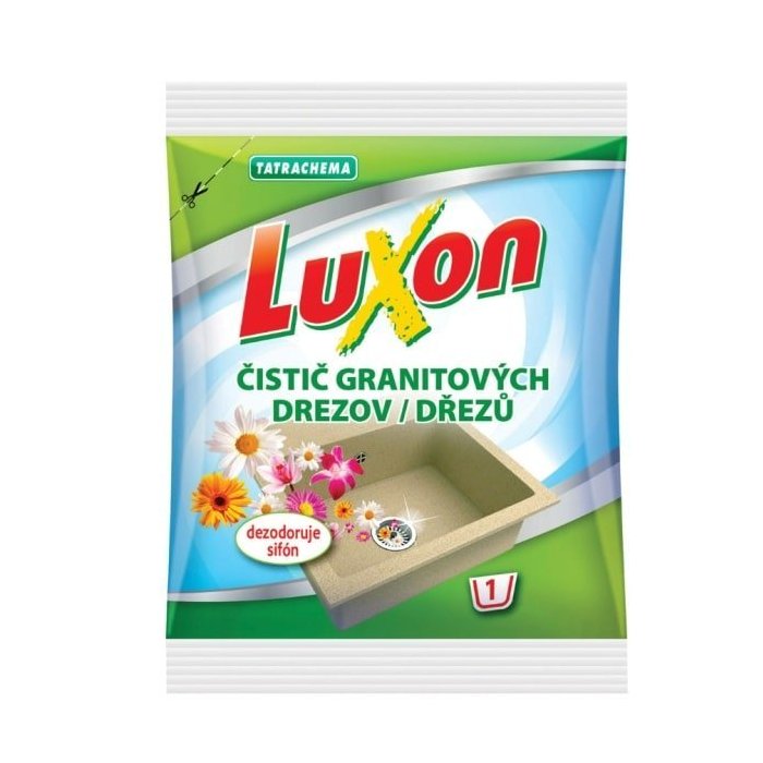 Čistiaci prostriedok Luxon na žulové drezy na odstránenie odolných nečistôt a škvŕn. Je vhodný pre silgranitové, granitové a nerezové drezy. Výrobok je s aktívnym kyslíkom a bez chlóru. S príjemnou vôňou. odstraňuje nečistoty a škvrny od ovocia, zeleniny, červeného vína, kávy, čaju atď.