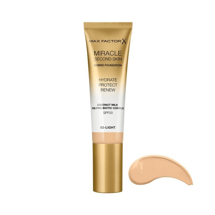Max Factor make-up Miracle Second Skin, vďaka kterému bude váš make-up ako vaša druhá koža. Unikátna technologia uzamkne pigmeny tak, aby bol výsledok dokonalý po dlhú dobu a zároveň ju bude plne hydratovať. Doprajte si starostlivosť od značky Max Factor.