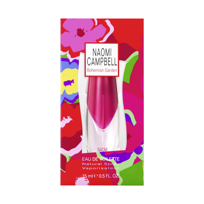 Vôňa Naomi Campbell Bohemian Garden pozýva jej nositeľku do bohémskej záhrady plnej kvetov, žiarivých farieb a bezstarostnej radosti zo života. Vôňu otvára ovocná sviežosť citrónu, šťavnatej hrušky a delikátneho broskyňového kvetu. Radosť a pestrosť pokračuje aj v srdci vône: slnečný kvet jazmínu, očarujúca konvalinka, žiarivý kvet pomarančovníka, pudrový kvet bavlníka a elegantná ruža upokojujú dušu ženy. Základ zložený z fascinujúceho pižma, čerstvého machu, príjemnej vanilky a krémovej kombinácie santalového a cédrového dreva dodáva vôni uvoľňujúci dotyk dokonalosti.