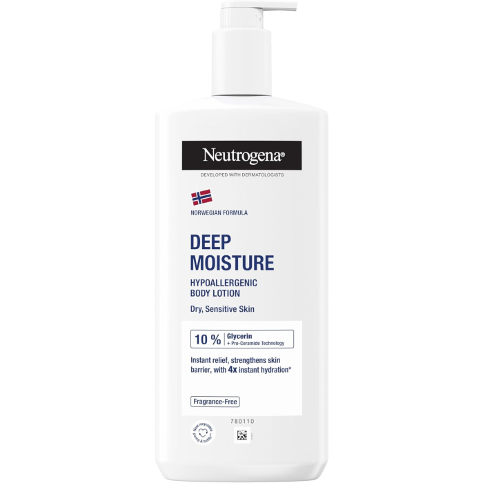 Pretože vaša suchá pokožka môže byť aj citlivá, potrebuje špeciálnu starostlivosť a pozornosť. Neutrogena® Deep Moisture hypoalergénne telové mlieko bolo vyvinuté s dermatológmi pre suchú a citlivú pokožku. Toto telové mlieko pre citlivú pokožku, ktoré preukázateľne dodáva svoju aktívnu zložku až do niekoľkých vrstiev hlboko do pokožky, poskytuje vlhkosť tam, kde je to najviac potrebné. Od prvej aplikácie je vaša pokožka chránená pred vonkajšími agresormi, ktoré ju vysušujú, a je na niekoľko hodín upokojená a jemná.