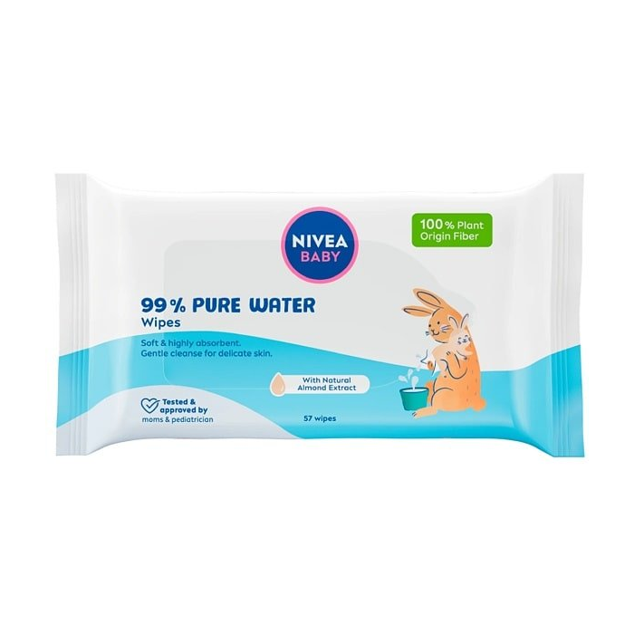 Doprajte svojmu dieťatku čistú a stále jemnú pokožku s vlhčenými čistiacimi utierkami Nivea Baby 99 % Pure Water! Nové zloženie obrúskov so 100 % prírodným mandľovým extraktom a obsahom 99 % vody pomáha chrániť a posilňovať detskú pokožku a podporuje jej prirodzený vývoj. Sú vyrobené zo 100 % rastlinných vlákien, vegánske a biologicky rozložiteľné. Čistiace obrúsky Nivea Baby 99 % Pure Water zabezpečia najmenším čistotu a tú najjemnejšiu starostlivosť.