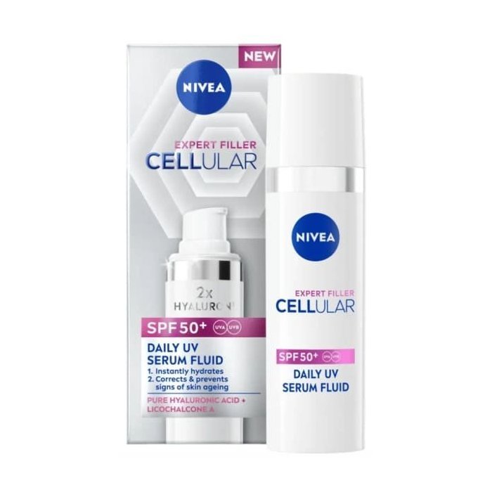 Chráňte svoju pleť proti predčasnému starnutiu spôsobenému slnkom a doprajte jej poriadnu dávku hydratácie deň čo deň. Dokonalú ochranu proti slnku a zároveň perfektnú hydratáciu pleti dodá NIVEA Denné UV Sérum Fluid Cellular Filler SPF 50+.