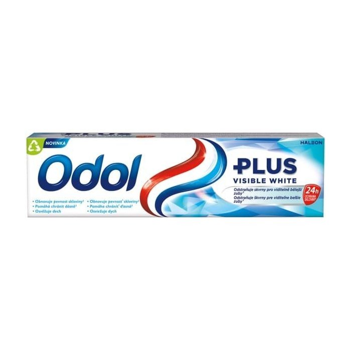 Odol Plus Visible White je zubná pasta určená na každodennú starostlivosť, ktorá spája ochranu zubov a jemný bieliaci efekt. Pomáha odstraňovať povrchové škvrny spôsobené jedlom a nápojmi, zároveň posilňuje sklovinu a chráni zuby pred vznikom kazu. Pasta je vhodná pre pravidelné čistenie dvakrát denne a podporuje prirodzene belší úsmev.