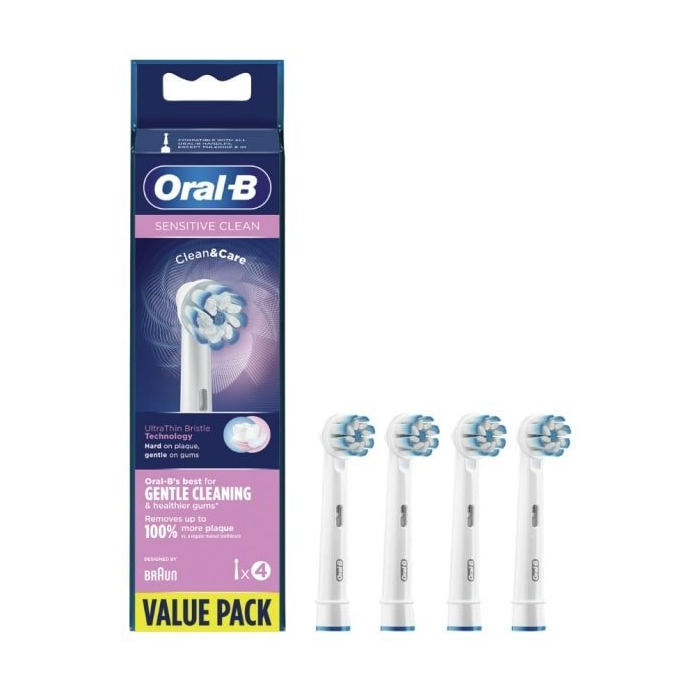 Náhradné čistiace hlavice Sensitive Clean k elektrickej zubnej kefke Oral-B sú skvelou voľbou na čistenie celej ústnej dutiny. Odstraňuje až o 100 % viac zubného povlaku a zabezpečuje zdravšie ďasná v porovnaní s bežnou manuálnou zubnou kefkou. Špeciálne navrhnutá pre starostlivosť o citlivé ďasná a odhalené zubné krčky. Guľatá hlavica v tvare okvetného lístka dokonale kopíruje tvar každého zubu. Kombinácia klasických a tenkých mäkkých vláken zaisťuje šetrné čistenie zubnej skloviny a ďasien a zároveň spoľahlivé odstránenie zubného povlaku. Náhradné čistiace hlavice Sensitive Clean od Oral-B sú kompatibilné s rukoväťami Oral-B okrem Pulsonic & iO.