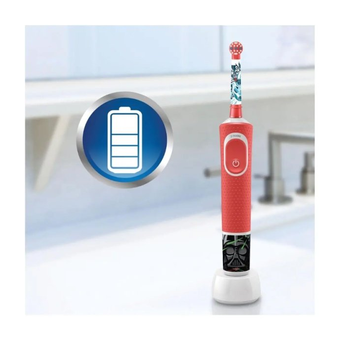Táto elektrická kefka s akumulátorovou batériou v rukoväti vydrží na jedno nabitie až 8 dní. Kefka je vhodná pre deti od 3 rokov a na prvý pohľad zaujme roztomilým dizajnom na motívy rozprávky Hviezdne vojny. Rukoväť kefky si môžete vylepšiť pomocou štyroch samolepiek.