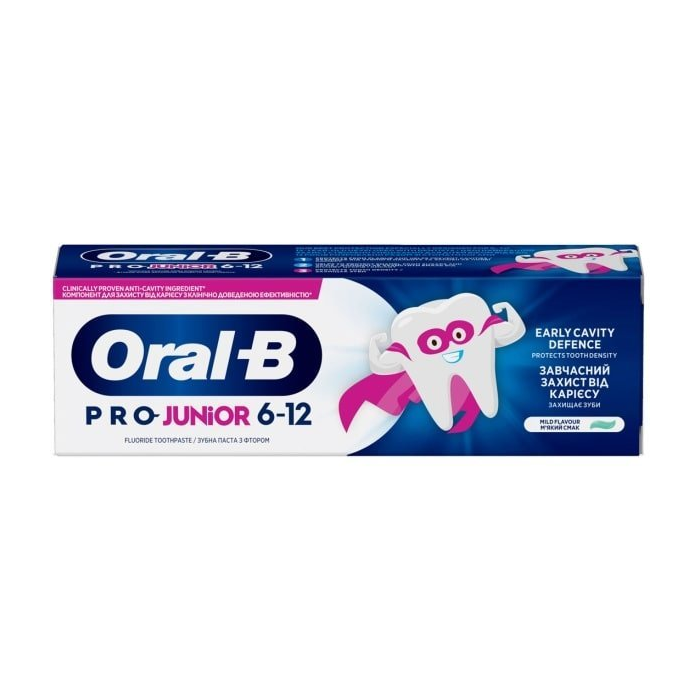 Oral-B Pre Junior zubná pasta je špeciálne navrhnutá pre deti vo veku 6–12 rokov. Vyvinutá spoločne so zubnými lekármi, pomáha predchádzať zubnému kazu a chráni zuby pred každodenným vplyvom kyselín a cukrov. Obsahuje fluorid v množstve vhodnom pre daný vek, ktorý pomáha chrániť sklovinu a má jemnú mätovú príchuť. Starajte sa o detské zúbky so zubnou pastou od značky Oral-B.