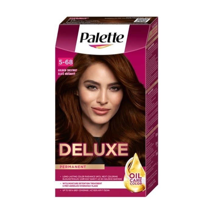Palette Deluxe farba na vlasy 5-68 Zlatisto orieškový je permanentný farba na vlasy s až 100% krytím šedín. Bohaté zloženie Oil-in-creme s vysoko koncentrovanými pigmentmi preniká do vlasov pre až 100% krytie šedín a poskytuje dlhotrvajúcu žiarivosť farby až do ďalšieho farbenia. Špeciálne vyvinutá starostlivosť, ktorá udržuje hydratáciu vlasov, prináša pocit hĺbkovej hydratácie a hodvábne hladkých a zdravých vlasov. Zloženie bez silikónov taktiež zlepšuje hebkosť vlasov, uľahčuje ich rozčesávanie a dodáva im neodolateľný lesk. Radujte sa z farieb s Palette Deluxe.