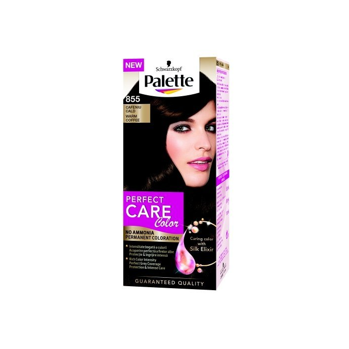 PALETTE Perfect Care Color 855 - Teplý Kávový, Dlhotrvajúca farba na vlasy Značka Palette prináša na trh novú kolekciu 20 perfektne ošetrujúcich odtieňov farieb Palette Perfect Care Color a to úplne BEZ AMONIAKU s obsahom luxusného elixíru z hodvábu. Dokonalá farba na vaše vlasy o akej ste vždy snívali je teraz na dosah. Táto receptúra využíva okrem vzácneho hodvábu aj viacvrstvovú technológiu, vďaka ktorej sa už počas farbenia vytvára niekoľko farebných vrstiev, ktoré sa postupne odhaľujú po každom umytí vlasov. Vďaka nej bude farba Vašich vlasov krásne žiarivá a vlasy chránené už počas ich farbenia. Farby Palette Perfect Care Color sú permanentné, s tretím stupňom trvácnosti a ponúkajú nám až 20 atraktívnych odtieňov. Vaše vlasy získajú neopakovateľnú jemnosť a intenzívny lesk.