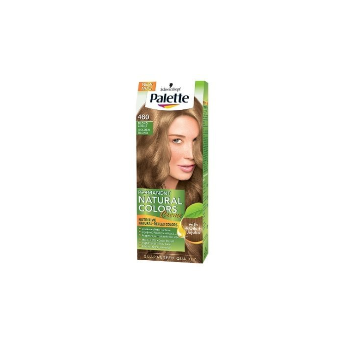 PALETTE Permanent Natural Color Prirozdene vyzerajúca trvácna farba na vlasy, so 4 olejmi a jojobou, odtieň 460 - zlatoplavá Prvá trvácna farba na vlasy Palette Pemanent Natural Color perfektne kryje šediny a zároveň sa stará o Vaše vlasy a dodáva im silu a blahodárnu starostlivosť. Inovatívna ošetrujúca krémová receptúra Palette teraz obsahuje menej amoniaku a rozmaznáva Vaše vlasy: * úžasným prirodzene vyzerajúcim, dlhotrvajúcim a žiarivým farebným výsledkom * hĺbkovým ošetrením pre silné vlasy * dokonalým krytím šedín * naviac základ sýteho farbiaceho krému je obohatený o jojobové mlieko a čisté výberové oleje * nová ošetrujúca maska pre lesk chráni vlasy pred vysúšaním * zosvetlí Vaše vlasy o 2 - 4 odtiene.