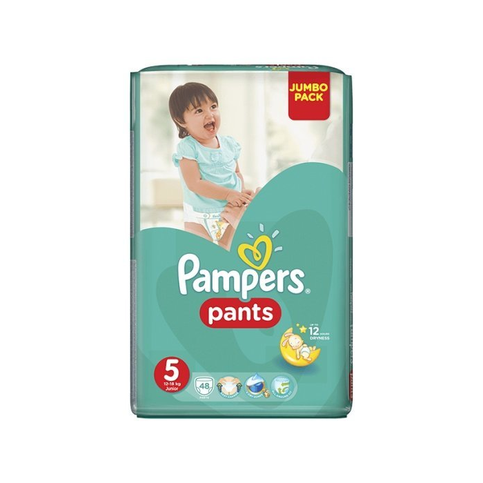 PAMPERS Pants 5 Junior, Naťahovacie plienkové nohavičky pre deti od 12kg do 18kg 48ks Ohýbanie, naťahovanie, batolenie. Nekonečné pokusy a pády. A konečne prvé krôčiky. Bod zlomu vo vývoji vyžaduje novú plienku, ktorá dokáže s Vaším maličkým držať krok. PAMPERS Pants sú skvelé naťahovacie plienkové nohavičky - vedia byť savé ako plienka a vďaka tomu je všetko v suchu. Váš drobček je teraz v neustálom pohybe, tak práve PAMPERS Pants - plienkové nohavičky - zvládnu jeho tempo. Môžete ich obliecť, znova vyzliecť, bez toho, aby ste ho príliš zdržovala alebo obmedzovala. Zvládnete hravo obdobie od prvých krokov až po učenie chodenia na nočník. * savé ako plienka, pohodlné ako nohavičky * 2 zóny Dry pre pocit sucha * mikropóry prepúšťajú vlhký vzduch * elastické boky a pásik zaisťujú pohodlie * až 12 hodín v suchu
