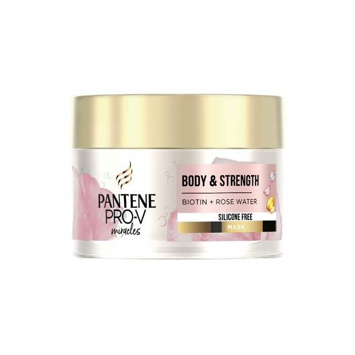 Zázrak pre jemné a riedke vlasy. Pantene PRO-V predstavuje novinku v podobe línie Miracles s biotínom a ružovou vodou. Maska na vlasy Body & Strength Biotin + Rose Water pomáha posilňovať vlasy poškodené úpravou a tepelným stylingom. Vysoko výživná zmes Pro-V zanechá vaše vlasy regenerované, pevnejšie a posilnené. A to už v priebehu 2 minút! Inovatívne zloženie PRO-V bez obsahu silikónov vlasy nezaťažuje a je testované inštitútom Swiss Vitamin Institute. Pre silné vlasy plné života je tu Pantene PRO-V Miracles Body & Strength!