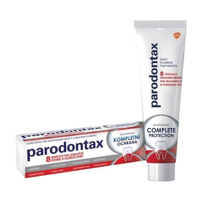 Zubná pasta Parodontax Kompletná ochrana Whitening poskytuje komplexnú starostlivosť o ústnu dutinu. Je určená na každodenné používanie a pomáha zastaviť a predchádzať krvácaniu ďasien – hlavnému príznaku ochorení ďasien.