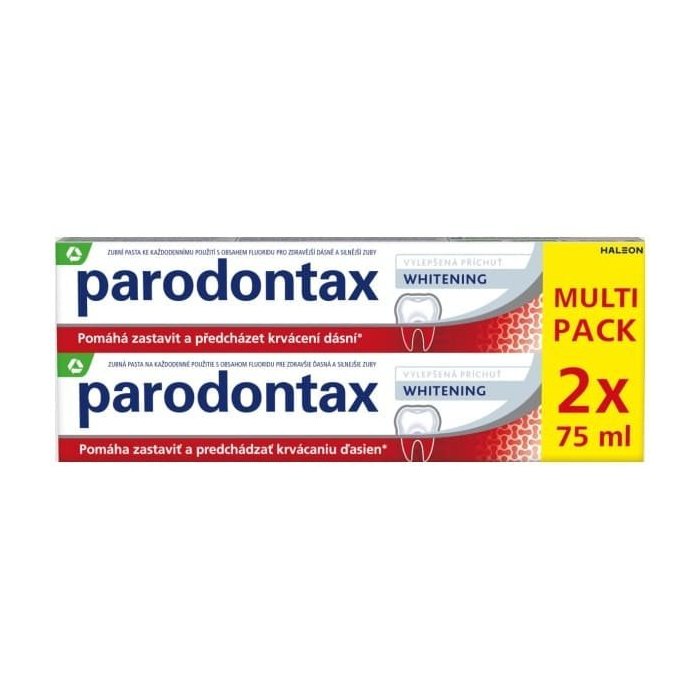 Zubná pasta Parodontax Whitening vo výhodnom dvojbalení je určená na každodennú starostlivosť o zuby a ďasná. Obsahuje fluorid, ktorý posilňuje zubnú sklovinu a chráni pred vznikom zubného kazu. Vďaka svojmu špeciálnemu zloženiu jemne odstraňuje povrchové škvrny a obnovuje prirodzenú belosť zubov, pričom je zároveň účinná v boji proti krvácaniu ďasien – jednej z hlavných príčin parodontózy.