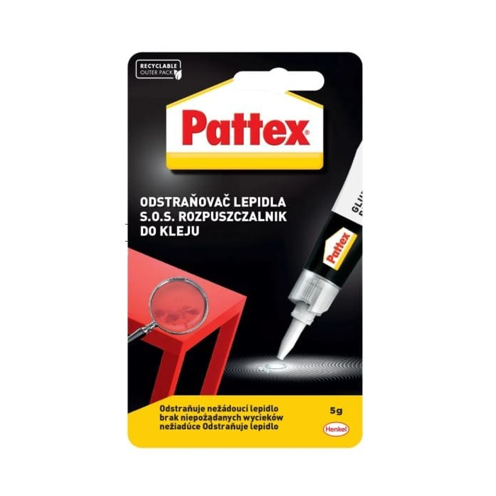 Pattex Odstraňovač lepidla je produkt na báze rozpúšťadla, ktoré je vhodné na odstraňovanie množstva druhov lepidiel zo zašpinených alebo zle zalepených objektov. Účinné rozpúšťadlo pôsobí na zvyšky lepidiel (kyanoakrylátov), ktoré ešte vo väčšej miere nepoškodili povrchy plastov a iných materiálov. Slúži na uvoľnenie prstov zlepených sekundovými lepidlami