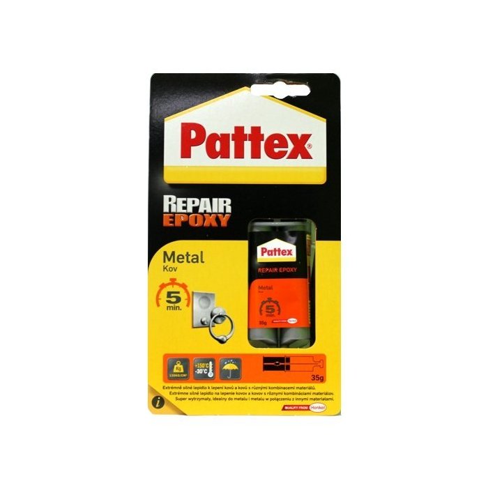 Pattex Repair Epoxy na kov Špeciálne dvojzložkové epoxidové lepidlo Pattex Repair Epoxy Metal je extrémne silné lepidlo na opravy a fixovanie kovov ako hliník, železo, oceľ a kovov s rôznymi kombináciami materiálov. Lepidlo možno použiť tak v interiéri ako aj v exteriéri, na opravu prasklín, netesností kovových nádrží a vodovodných potrubí. Lepidlo nie je vhodné na lepenie PP, PE a PTFE Vlastnosti lepidla Pattex Repair Epoxy Metal: - farba: kovovo šedá - doba konečnej pevnosti: 24 hodín - pevnosť: 130 kg/cm2 - tepelná odolnosť: -30°C až +150°C, pri dlhodobo namáhaných spojoch max. 60°C Aplikácia lepidla Pattex Repair Epoxy Metal: - obidve zložky lepidla je potrebné poriadne rozmiešať v pridanej nádobke pridanou špachtľou - zmes je potrebné miešať kým nebude mať konzistentnú farbu a štruktúru - lepidlo sa nanáša na jednu z lepených častí - lepené diely pevne stlačte dokopy - lepidlo tvrdne približne 4 minúty v závislosti od teploty materiálu a okolia - lepený spoj je možné namáhať najskôr po 2 hodinách od aplikácie lepidla
