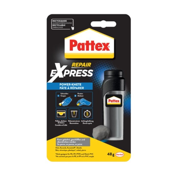 PATTEX® Opravná hmota Kov je epoxidová hmota určená na lepenie, modelovanie a plnenie takmer všetkých materiálov vyskytujúcich sa v domácom prostredí. Po vytvrdnutí sa dá opracovať. Zmes je odolná voči poveternostným podmienkam a širokému spektru čistiacich prostriedkov, rozpúšťadiel a vody. Hmota je vo farbe kovu.