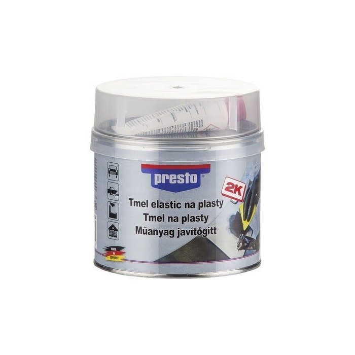 Presto tmel na plasty „obsahujúci styrén“ je 2-zložkový čierny polyesterový tmel na vyplnenie škrabancov a poškodení a na následnú úpravu lepených plastových dielov. Trvalo uzatvára malé a stredne veľké poškodené miesta na takmer všetkých plastoch, ako sú PP, PUR, ABS, PA, PVC. Vďaka svojej tixotropii a mäkkosti je možné ľahko znovu vytvoriť profily a kontúry.