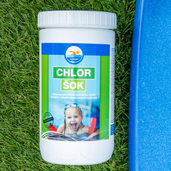 Použitie: Pred aplikáciou prípravku skontrolujte pH vody príslušným testerom, nastavte hodnotu pH na 6,8-7,6 pomocou prípravkov pH MÍNUS alebo pH PLUS . Dávkujte 90 g prípravku CHLOR ŠOK na 10 m 3 vody v bazéne, podľa miery znečistenia je možné túto dávku znížiť alebo zvýšiť. Prípravok sa pomaly nasype do skimmera pri zapnutej cirkuláciu vody tak, aby bol granulát plynule vťahovaný do cirkulačného systému. Odmeranú dávku je možné tiež vopred rozpustiť vo vode v plastovej nádobe a vzniknutú suspenziu potom pomaly vliať do bazéna. V priebehu šokovej úpravy vody nie je vhodné používať bazén na kúpanie z dôvodu vysokej koncentrácie chlóru, to je možné obnoviť až po jej poklesu na max. 0,5 mg / l. Po vyčistení vody je možné opäť nasadiť prípravky na úpravu vody CHLOR TABLETY , KOMBI TABLETY alebo MULTI TABLETY 5v1 .