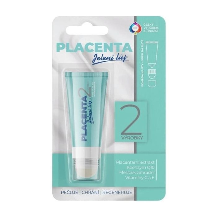 Obsahuje: Extrakt z nechtíka záhradného | Panthenol | Koenzým Q10 | Placentárny extrakt | Vitamín C a E A tak jediný kozmetický prípravok lepší ako Placenta ... sú dve Placenty . Jedno balenie, dva prípravky na pery aj ruky: