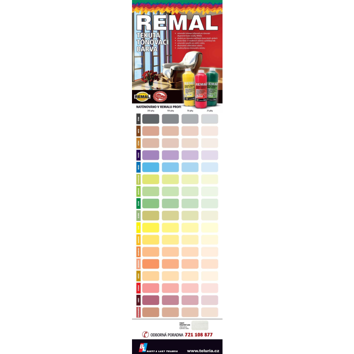 REMAL TEKUTÁ TÓNOVACIA FARBA je určená pre interiéry a používa sa k tónovaniu bielych maliarskych farieb. Farebné odtiene sú stále, majú vysokú farbiacu schopnosť. Odtiene čierna, hnedá, béžová, okrová a červenohnedá sa môžu použiť aj k zafarbeniu vodouriediteľných farieb v exteriéroch.