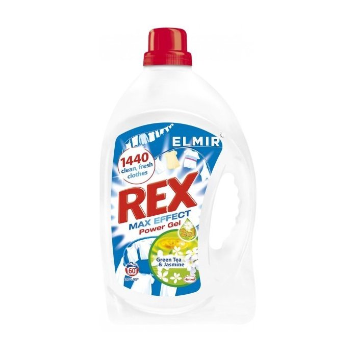 REX Max Effect Power Gel 2v1 Green Tea & Jasmine, prací gél 3,96l = 60 praní Tekutý prací gél Rex Green Tea & Jasmine s príjemnou vôňou je určený pre biele prádlo. Je šetrný k oblečeniu, účinne odstraňuje škvrny aj pri najnižších teplotách a zachováva žiarivo bielu farbu. Vďaka špeciálnemu zloženiu uľahčuje žehlenie.