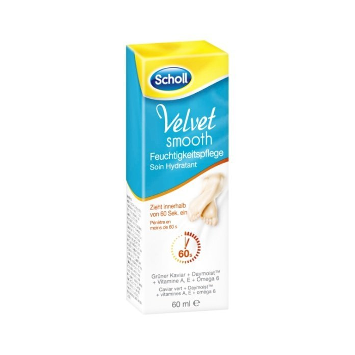 SCHOLL Velvet Smooth, Hydratačný denný krém 60 ml - hydratačný krém je vhodný pre každodennú starostlivosť. - vdaka jeho zloženiu s obsahom zeleného kaviáru, vitamínu E hydratuje vaše chodidlá po celý deň. - cenné esenciálne mastné kyseliny Omega 6 chránia tiež citlivú pokožku nôh. - krém sa vstrebáva behom 60 sekúnd a nie je mastný. - vhodný po použití brúsky Scholl Velvet Smooth Express Pedi.