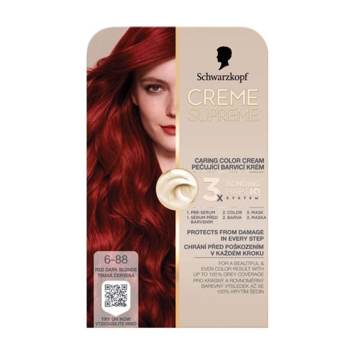 Získajte vysnívanú farbu vlasov s maximálnou starostlivosťou! Schwarzkopf Creme Supreme je permanentná farba na vlasy (stupeň 3), ktorá nielenže poskytuje krásny a rovnomerný farebný výsledok, ale aj intenzívne chráni a posilňuje vlasy vďaka inovatívnej 3x Bonding HaptIQ technológii.