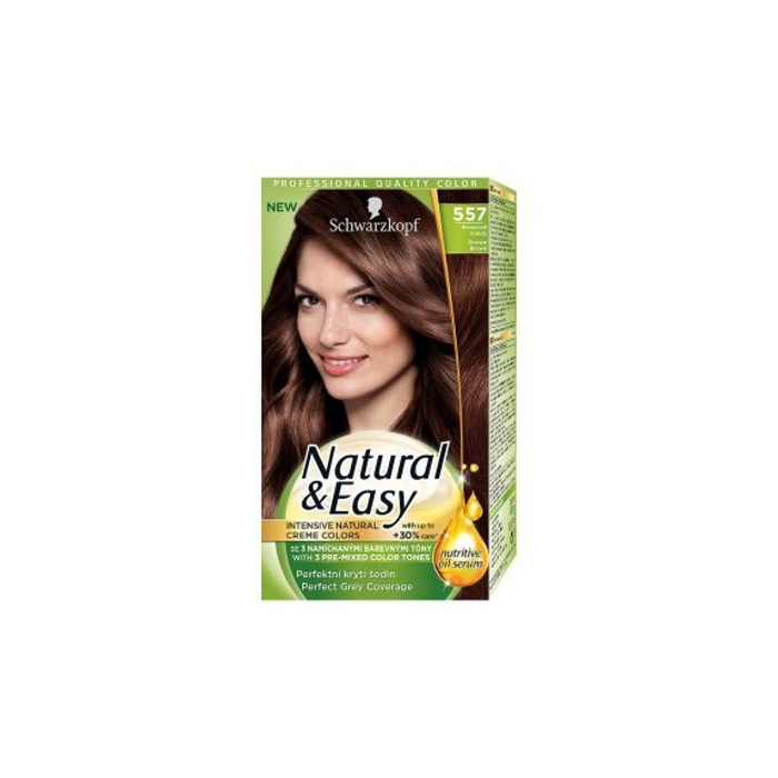Schwarzkopf Natural & Easy farba na vlasy Bronzovohnedý 557 Ako docielim prirodzenú farbu plnú viacfarebných odleskov? Prirodzená farba vlasov obsahuje viacero farebných tónov a odleskov. Práve vďaka tomu pôsobí tak prirodzene a výrazne. Natural & Easy dokáže to isté, tri harmonizujúce farebné odtiene sú namiešané tak, aby vytvorili žiarivý viacfarebný a prirodzene farebný výsledok. Prečo je Natural & Easy taká ošetrujúca? Natural & Easy - obohatená o vzácne ošetrujúce olejové sérum - ošetruje vlasy a dodá im až do 30% viac lesku*! Pretože iba na zdravo vyzerajúcich a ošetrených vlasoch vyzerá farba obzvlášť žiarivo. *do 30% viac starostlivosti v porovnaní s neošetrenými vlasmi. Je Natural & Easy dlhotrvácna a zosvetlí moje vlasy? Áno! Natural & Easy zosvetlí vlasy až do 3 odtieňov pre nádherný blond odtieň a dlhotrvajúcu, žiarivú farbu plnú viacfarebných odleskov!