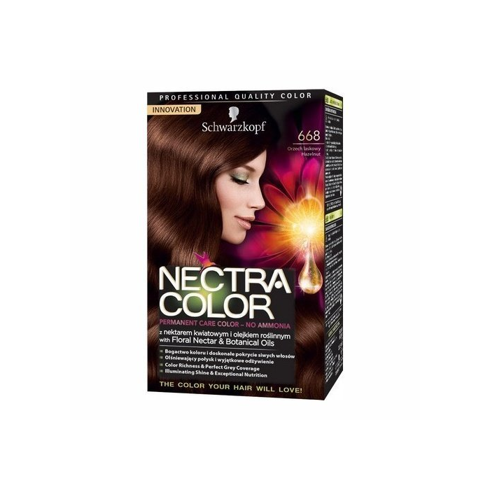 Schwarzkopf Nectra Color Prvá ošetrujúca farba s kvetinovým nektárom a botanickými olejmi, odtieň 668 - oriešková FARBA, KTORÚ BUDÚ VAŠE VLASY MILOVAŤ! - Nektár s názvom Schwarzkopf Nectra Color. Schwarzkopf ponúka kolekciu Nectra Color v sýtych žiarivých farbách s nádhernou kvetinovou vôňou a leskom. Vlasom dodá intenzívnu a trvácnu farbu s očarujúcim leskom. Výsledkom sú oslnivé a hodvábne hebké vlasy. Kvetinový nektár predstavuje prírodu v čistej forme. Získava sa z výťažkov kvetov (Combretum farinosum), koncentrovaného v srdci okvetných lístkov. Pozostáva z vody a prírodného cukru a obsahuje množstvo minerálov, aminokyseliny, vitamíny a esenciálne oleje. Schwarzkopf Nectra Color je permanentná farba, ktorá je aplikovaná pomocou štetca a vďaka unikátnej receptúre šetrne obalí každý jeden pramienok vlasov a dodá mu hebkosť a žiarivý lesk. Vlasové vlákno nepoškodzuje, krásne pri farbení vonia a neobsahuje amoniak ani minerálne oleje. Balenie obsahuje: 1 vyvíjacie mlieko 60ml 1 farbiaci krém 60ml 1 ošetrujúci kondicionér pre lesk 22,5ml 1 návod na použitie 1 pár profesionálnych rukavíc