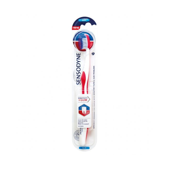 Zubná kefka Sensodyne Sensitivity & Gum Soft je špeciálne navrhnutá pri problémoch s citlivými zubami a ďasnami. Umývanie zubov bude veľmi pohodlné a jemné. Kefka päťkrát lepšie dosiahne pozdĺž línie ďasien a zároveň citlivo a precízne umýva aj povrch zubov. Dokonale tak odstráni plak spôsobujúci problémy s ďasnami.