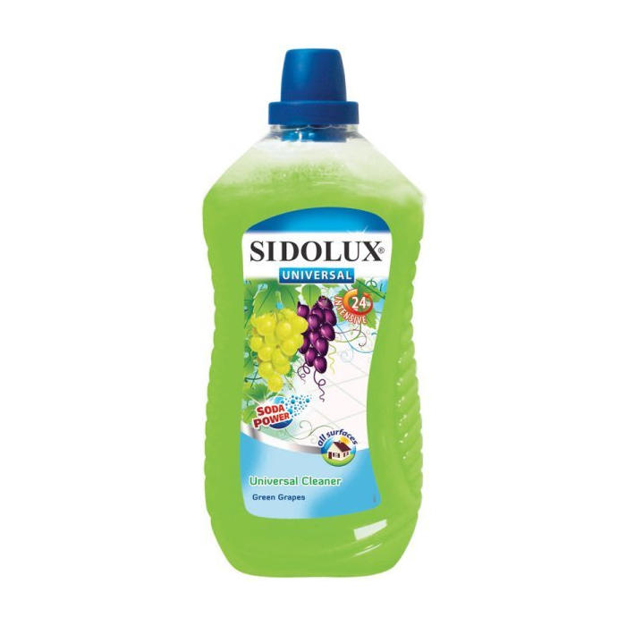 Sidolux univerzálny čistiaci prostriedok s vôňou zelených hrozna je spojením neodolateľné dlhotrvajúca ovocné vône s neuveriteľne účinnými čistiacimi vlastnosťami. Tajomstvom jeho nebývalej sily v boji prosti nečistote je unikátny systém Soda Power, ktorého pôsobenie zmäkčuje vodu, a vďaka tomu odstraňuje Sidolux univerzálny čistiaci prostriedok veľmi rýchlo nečistoty z povrchu. S univerzálnym čistiacim prostriedkom Sidolux je upratovanie rýchlejšie, jednoduchšie a oveľa účinnejšie. Umývanie podlahy už sa zaobíde bez drhnutia a povrch zostane bez šmúh. Produkt možno použiť na všetky umývateľné povrchy, ako sú okná, podlahy, stoly, pracovné dosky atď.