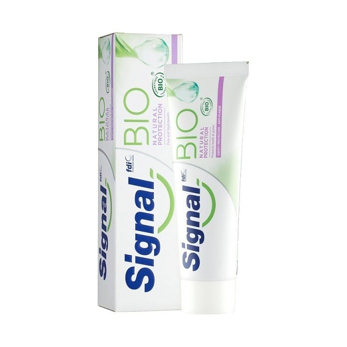 Signal BIO zubná pasta Natural Protection s prírodnými rastlinnými extraktmi je certifikovaná BIO kvalitou. Receptúra s výťažkom z Aloe vera spolu so zinkom prináša kompletnú prirodzenú ochranu. Zaisťuje účinnú ochranu ďasien a zubov pred zubným povlakom. Naviac je obohatená o fluorid pre silné zuby a ochranu pred zubným kazom.