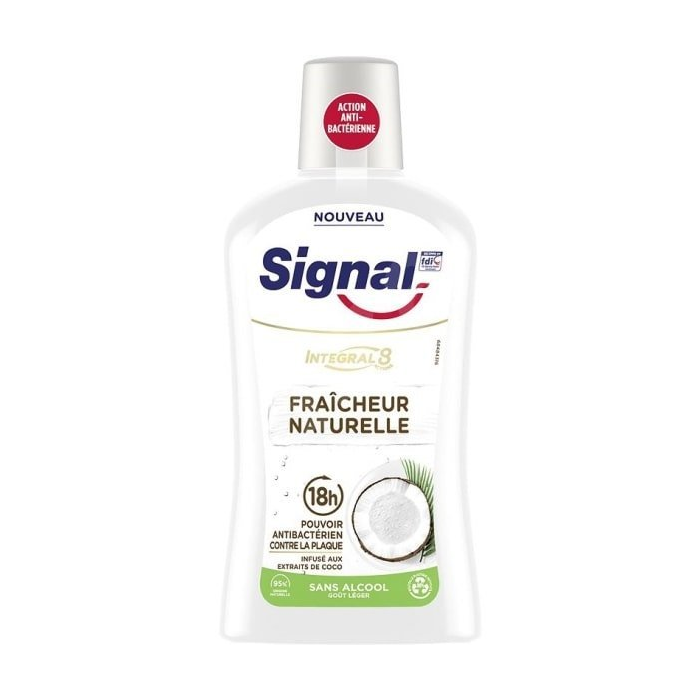 Ústna voda Signal Integral 8 Fraîcheur Naturelle Coconut pre kompletnú ochranu, optimálnu dentálnu hygienu a prirodzenú belosť zubov.