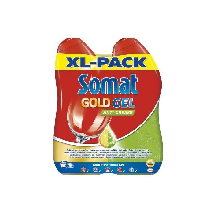 SOMAT Gold Gel Anti Grease, Multifunkčný gél do umývačky s aktívnym odmasťovačom 2x600ml SOMAT Gold Gel Anti Grease je určený do umývačiek riadu a navyše je obohatený o aktívny odmasťovač, ktorý zabezpečí: hygienickú čistotu a vysoký lesk. Gél do umývačky riadu SOMAT Gold Gel Anti Grease má príjemnú vôňu.