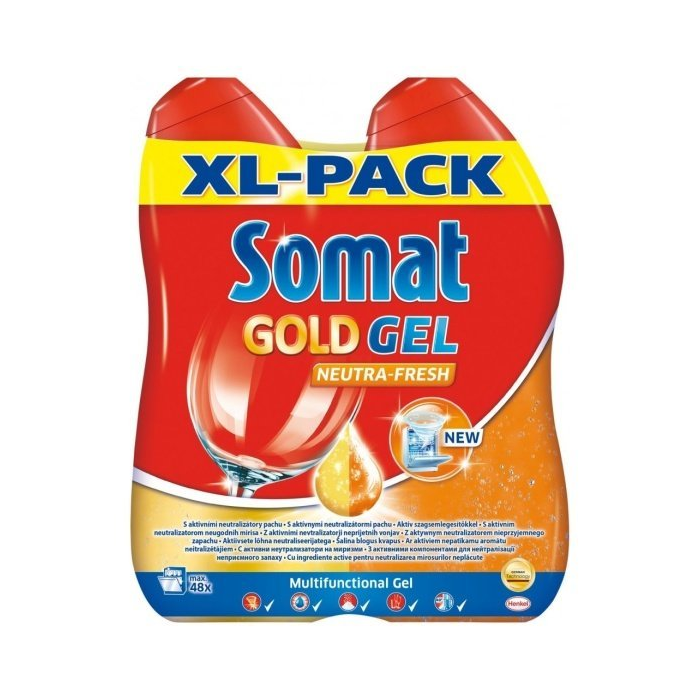 SOMAT Gold Gel Neutra Fresh, Multifunkčný gél na umývanie riadu do umývačky 2x600ml SOMAT Gold Gel Neutra Fresh je určený do umývačiek riadu a navyše je obohatený o octovú zložku, ktorá zabezpečí: hygienickú čistotu, vysoký lesk a dokonca neutralizuje pachy. Gél do umývačky riadu SOMAT Gold Gel Neutra Fresh má príjemnú vôňu.