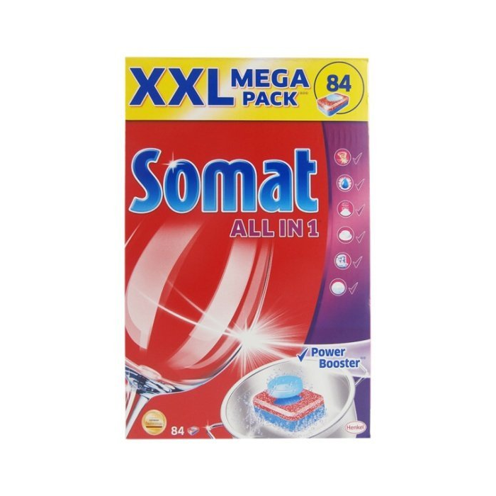 SOMAT UR Mega All in One, tablety do umývačky riadu 84 ks Somat All in 1- tablety všetko v jednom so silou Power Booster prinášajú perfektnú čistotu a žiarivý lesk a zahŕňajú nasledujúce funkcie: • Umývací prostriedok: - pre perfektnú čistotu. - oplachovacie - pre oslňujúci lesk Funkcia soli: - zabraňuje usadzovaniu vápenatých škvŕn na riad. - odstraňuje čajové škvrny. • Ochrana umývačky - chráni umývačku pred usadzovaním vodného kameňa. • Efekt odmáčanie - účinný ako predumývanie. • Power Booster - pomáha odstrániť odolné škvrny bez nutnosti predumývanie.