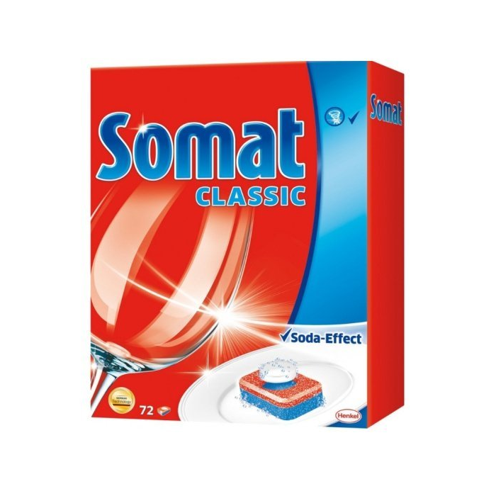 SOMAT UR XL Classic Tabs, tablety do umývačky riadu 72 ks Somat Classic tablety so Soda-Effect 72 tabliet. Somat Classic tablety odstraňujú aj tie najodolnejšie škvrny a pripáleniny – pre neprekonateľnú čistotu. Vďaka čistiacej technológii Soda-Effect bude váš riad perfektne čistý a žiarivý!