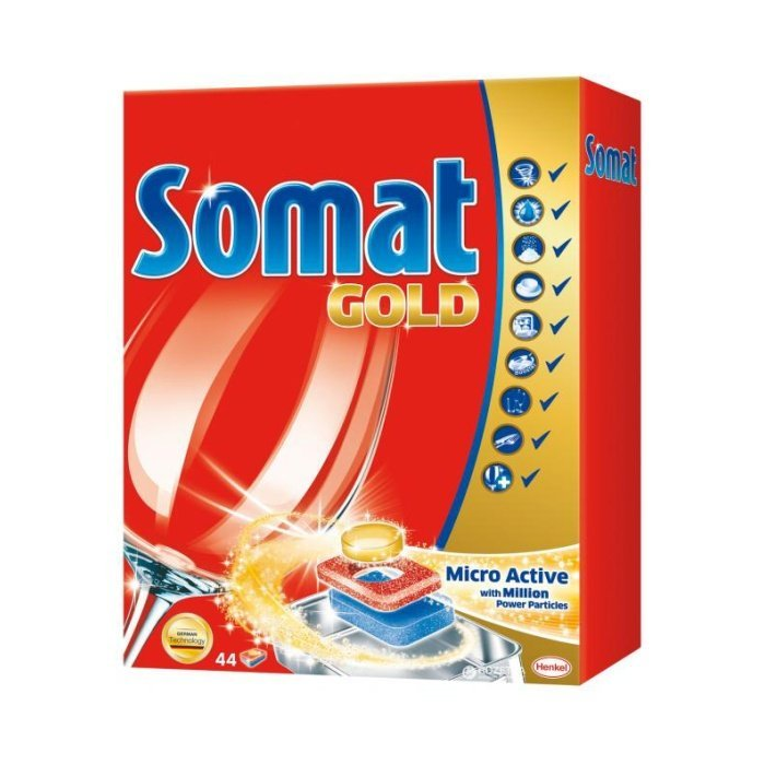 SOMAT UR XL Gold Tabs, tablety do umývačky riadu 44 ks Tablety Somat Gold spoľahlivo odstraňujú aj tie najodolnejšie nečistoty a zvyšky jedla. Vďaka technológii Soda Effectbude váš riad perfektne žiarivý a čistý. V balení nájdete 44 ks tabliet.