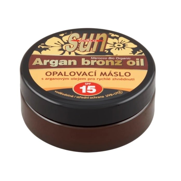 VIVACO sun opaľovacie maslo s arganovým olejom OF15 pre intenzívne, rýchle a dlhotrvajúce opálenie. Zjemňujúce prírodné oleje chránia pred vysušovaním a starnutím pokožky a napomáhajú dlhodobému zhnednutiu pokožky. Zároveň sa pri nanášaní na pokožku maslo rozpúšťa a ľahko sa rozotiera. Vyskúšajte opaľovacie maslo s arganovým olejom od značky VIVACO!