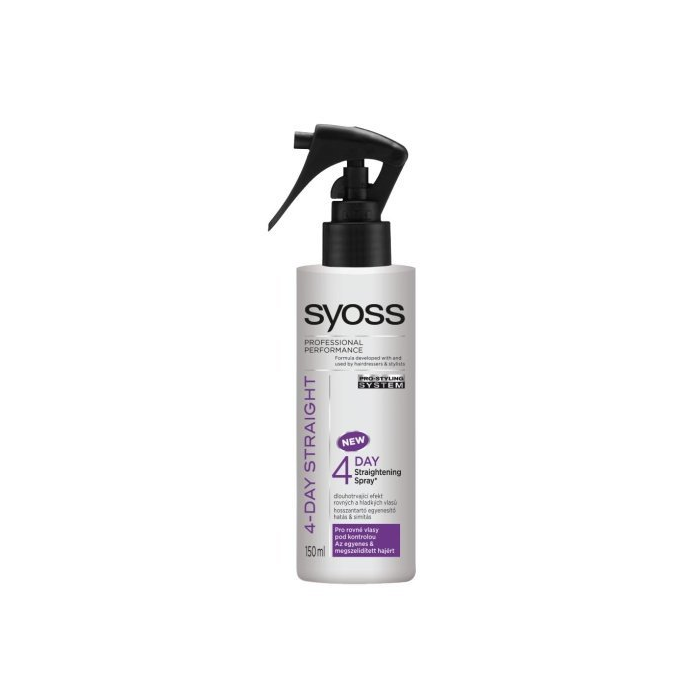 SYOSS 4 Day Straightening Spray, uhladzujúci sprej pre viditeľne rovnejšie a hladšie vlasy 150ml Uhladzujúci sprej SYOSS 4 Day Straightening Spray s dlhotrvácnym efektom rovných vlasov pre použitie so žehličkou na vlasy alebo fénom. Vyhladzuje vlasy prameň po prameni a navyše ich chráni pred teplým vzduchom. Vlasy sú viditeľne rovnejšie až do 4 dní alebo do ich ďalšieho umytia. * vlasy bez zaťaženia * kontrola proti krepovitosti vlasov Použitie: Nepoužívajte žehličku na mokré vlasy, mohla by vám ich poškodiť! Na suché vlasy: nastriekajte na jednotlivé časti vlasov pred použitím žehličky na vlasy. Na mokré vlasy: nastriekajte rovnomerne na všetky vlasy pred ich fénovaním, suché vlasy si potom vyžehlite.