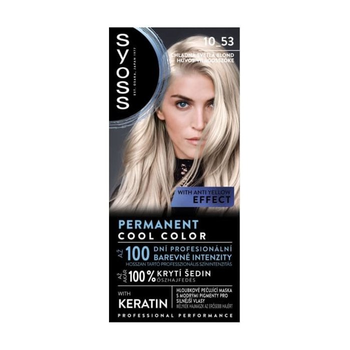 Syoss Cool Color 10-53 je vaša cesta k dokonalému vzhľadu s chladnou svetlou blond farbou. Farbiaci krém s chladnými farebnými odleskami a keratínom preniká hlboko do vlasového vlákna, efektívne neutralizuje nežiadúce žlté tóny a dodáva vašim vlasom profesionálnu intenzitu farby až na 100 dní. So 100% krytím šedín sa môžete tešiť na vlasy, ktoré sú nielen krásne, ale aj zdravé. Hĺbkovo ošetrujúca maska s modrými pigmentami a keratínom posilňuje vlasy zvnútra, zatiaľ čo modré pigmenty odstraňujú žlté podtóny a dodávajú vlasom ľadový lesk. Odtieň chladná svetlá blond je ideálna pre svetlo blond až stredne blond vlasy, takže si môžete užívať oslnivý a prirodzený vzhľad. Doprajte svojim vlasom starostlivosť a krásu s farbou Syoss Cool Color!