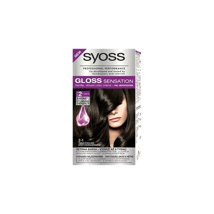 Syoss Gloss Sensation, Šetrná farba na vlasy s posilňovačom farby a krémom pre lesk, odtieň 2-1 Tmavá čokoláda Povedzte áno ohromujúcej sviežosti farby, povedzte áno senzačne žiarivým vlasom! Syoss Gloss Sensation: - farbiaci krém pre lesk a úžasný žiarivý farebný výsledok - až na 8 týždňov - až 2x viac lesku (v porovnaní s neošetrenými vlasmi) - oslňujúce oživenie farby - šetrné farby - optimálne krytie šedín Posilňovač farby a krém pre lesk: Dvojito účinný posilňovač farby bez amoniaku a krém pre lesk viditelne oživí farbu a lesk vlasov. Farebné mikročastice sú zanesené do povrchu vlasov pre úžasný farebný výsledok. Ochranná žiarivá vrstva uzavre farbu vo vlasoch a dodá im vysoký lesk. Farbiaci krém pre lesk, tmavo hnedé odtiene s oslňujúcimi čokoládovými a teplými zlatými odleskami, postupne zmývateľná farba - vydrží až 8 týždňov, s posilňovačom farby a krémom pre lesk, viditeľne zlepšuje kvalitu vlasov, optimálne kryje šediny, o 50 % menšia lámavosť vlasov a rozštiepených konečkov v porovnání s neošetřenými vlasmi.