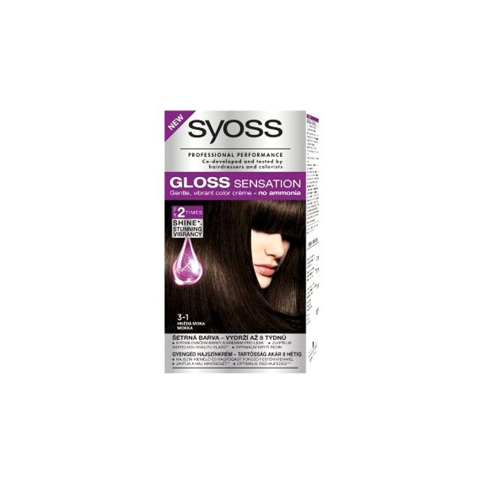 Syoss Gloss Sensation, Šetrná farba na vlasy s posilňovačom farby a krémom pre lesk, odtieň 3-1 Hnedá mokka Povedzte áno ohromujúcej sviežosti farby, povedzte áno senzačne žiarivým vlasom! Syoss Gloss Sensation: - farbiaci krém pre lesk a úžasný žiarivý farebný výsledok - až na 8 týždňov - až 2x viac lesku (v porovnaní s neošetrenými vlasmi) - oslňujúce oživenie farby - šetrné farby - optimálne krytie šedín Posilňovač farby a krém pre lesk: Dvojito účinný posilňovač farby bez amoniaku a krém pre lesk viditelne oživí farbu a lesk vlasov. Farebné mikročastice sú zanesené do povrchu vlasov pre úžasný farebný výsledok. Ochranná žiarivá vrstva uzavre farbu vo vlasoch a dodá im vysoký lesk. Farbiaci krém pre lesk, tmavo hnedé odtiene s oslňujúcimi čokoládovými a teplými zlatými odleskami, postupne zmývateľná farba - vydrží až 8 týždňov, s posilňovačom farby a krémom pre lesk, viditeľne zlepšuje kvalitu vlasov, optimálne kryje šediny, o 50 % menšia lámavosť vlasov a rozštiepených konečkov v porovnání s neošetřenými vlasmi.