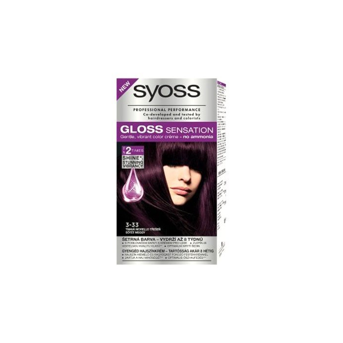 Syoss Gloss Sensation, Šetrná farba na vlasy s posilňovačom farby a krémom pre lesk, odtieň 3-33 Tmavá Morello čerešňa Povedzte áno ohromujúcej sviežosti farby, povedzte áno senzačne žiarivým vlasom! Syoss Gloss Sensation: - farbiaci krém pre lesk a úžasný žiarivý farebný výsledok - až na 8 týždňov - až 2x viac lesku (v porovnaní s neošetrenými vlasmi) - oslňujúce oživenie farby - šetrné farby - optimálne krytie šedín Posilňovač farby a krém pre lesk: Dvojito účinný posilňovač farby bez amoniaku a krém pre lesk viditelne oživí farbu a lesk vlasov. Farebné mikročastice sú zanesené do povrchu vlasov pre úžasný farebný výsledok. Ochranná žiarivá vrstva uzavre farbu vo vlasoch a dodá im vysoký lesk. Farbiaci krém pre lesk, tmavo hnedé odtiene s oslňujúcimi čokoládovými a teplými zlatými odleskami, postupne zmývateľná farba - vydrží až 8 týždňov, s posilňovačom farby a krémom pre lesk, viditeľne zlepšuje kvalitu vlasov, optimálne kryje šediny, o 50 % menšia lámavosť vlasov a rozštiepených konečkov v porovnání s neošetřenými vlasmi.