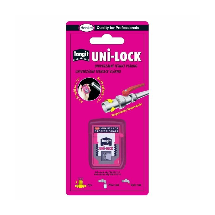 Tangit Uni-Lock univerzálne tesniace vlákno je pripravené na okamžité použitie. Nahradzuje konopné vlákno a PTFE pásky. Jednoduchá aplikácia. Umožňuje rýchle nastavenie výpustných kohútikov. Potrubie s vodou, plynom a stlačeným vzduchom je okamžite utesnené. Teplotná odolnosť je od -20°C do +130°C. Odolnosť voči tlaku do 16 barov. Používa sa: - na utesnenie kovových a plastických závitov potrubných systémov s vodou, plynom a stlačeným vzduchom - na pripojenie výpustných kohútikov a odbočiek potrubí - pri inštalácii potrubí stlačeného vzduchu Použitie: Vyčistite závit a zdrsnite ak je to potrebné. Tesniace vlákno naviňte okolo závitu v smere závitu. Počet obtočení závisí od priemeru závitu. V prípade spájania plastov sa vyžaduje dvojnásobný počet závitov. Korekcia spoja je možná bez poškodenia vlákna.