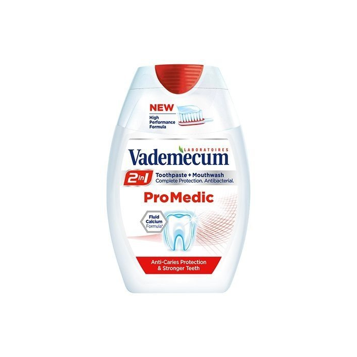 VADEMECUM 2v1 Pro Medic, zubná pasta 75ml Zubná pasta Vademecum 2v1 Pro Medic obsahuje fluoridovú zubnú pastu a antibakteriálnu ústnu vodu. Posiluje a ochraňuje zuby. Hĺbková ústna hygiena. S fluoridovou ochranou. 100% sviežosť. Obsahuje fluorid sodný (1450ppmF).