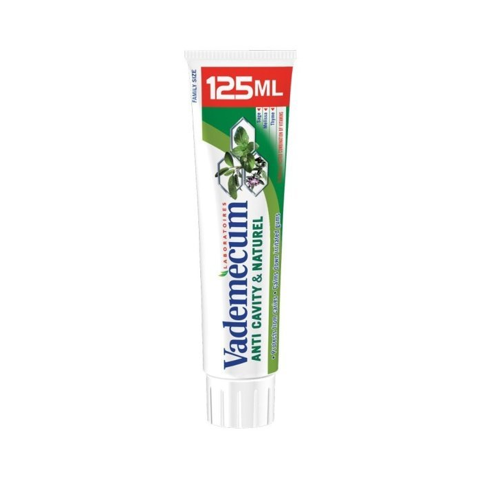 Receptúra zubnej pasty Vademecum Anti Caries + Naturel s výťažkom z byliniek a klinicky overovaná kombinácia vitamínov upokojuje podráždené ďasná a pomáha pri prevencii zápalu ďasien. Zároveň poskytuje zubom odolnosť voči zubnému kazu. Blahodárne účinky pre ďasná v kombinácií s vitamínmi sú klinicky testované. Navyše, zubná pasta s obsahom fluóru podporuje remineralizáciu.