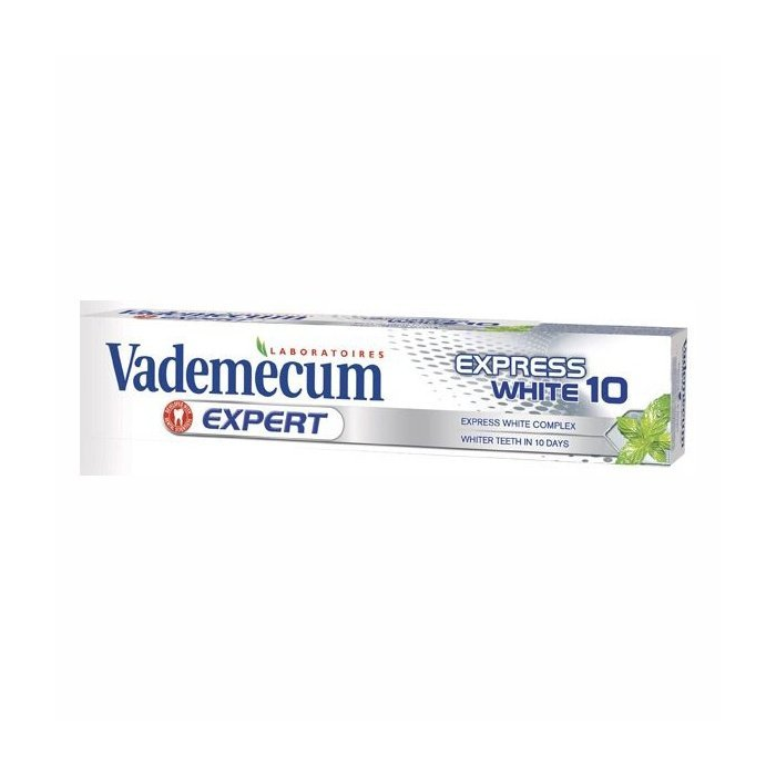 Zubná pasta Vademecum Express White 10 poskytuje spoľahlivý bieliaci účinok už po 10 dňoch používania. Bieliaci účinok je daný kombináciou hydratovaného oxidu kremičitého, oxidu hlinitého a sodíka bicarbona. Ďalej obsahuje zdroj vápnika (calcium glycerophosphate), ktorého ióny hrajú dôležitú úlohu v kombinácii s fluórom v procese remineralizácie zubov.